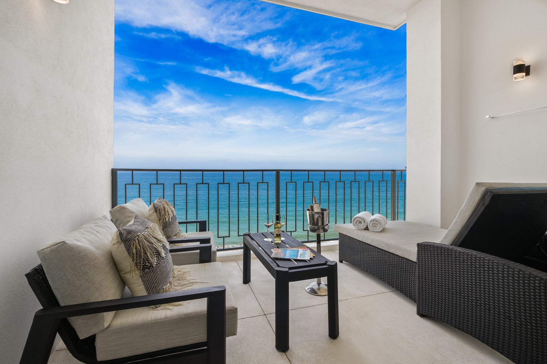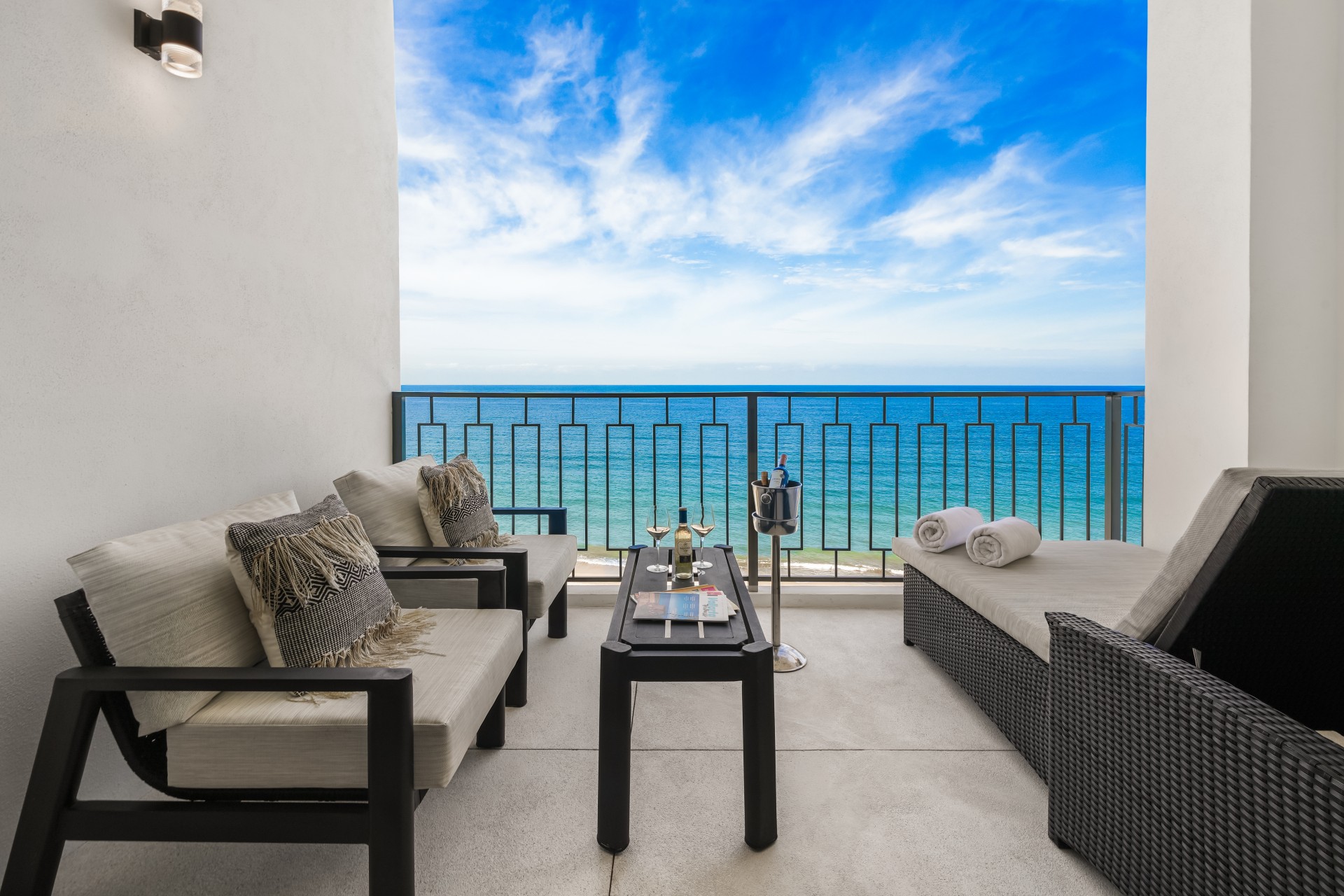 Experience the epitome of casual luxury in this two-bedroom penthouse suite, featuring a private balcony, a king bedroom, a second bedroom with two queen beds, a full kitchen, and a panoramic ocean view. For larger groups, the option to connect to an adjoining king room is available, transforming the space into a three-bedroom waterfront haven.